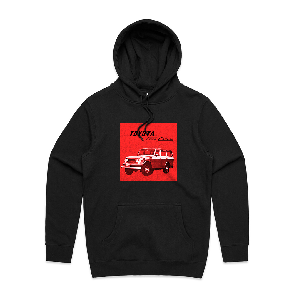 The Toyota Vintage LandCruiser 55 Series Graphic Black Hoodie is made from a durable 80% cotton and 20% recycled polyester anti-pill fleece blend for warmth and comfort. It features a regular fit, lined hood, kangaroo pocket, and ribbed cuffs. The bold 55 Series LandCruiser red box print adds a vintage touch, while the preshrunk fabric ensures lasting shape and comfort.