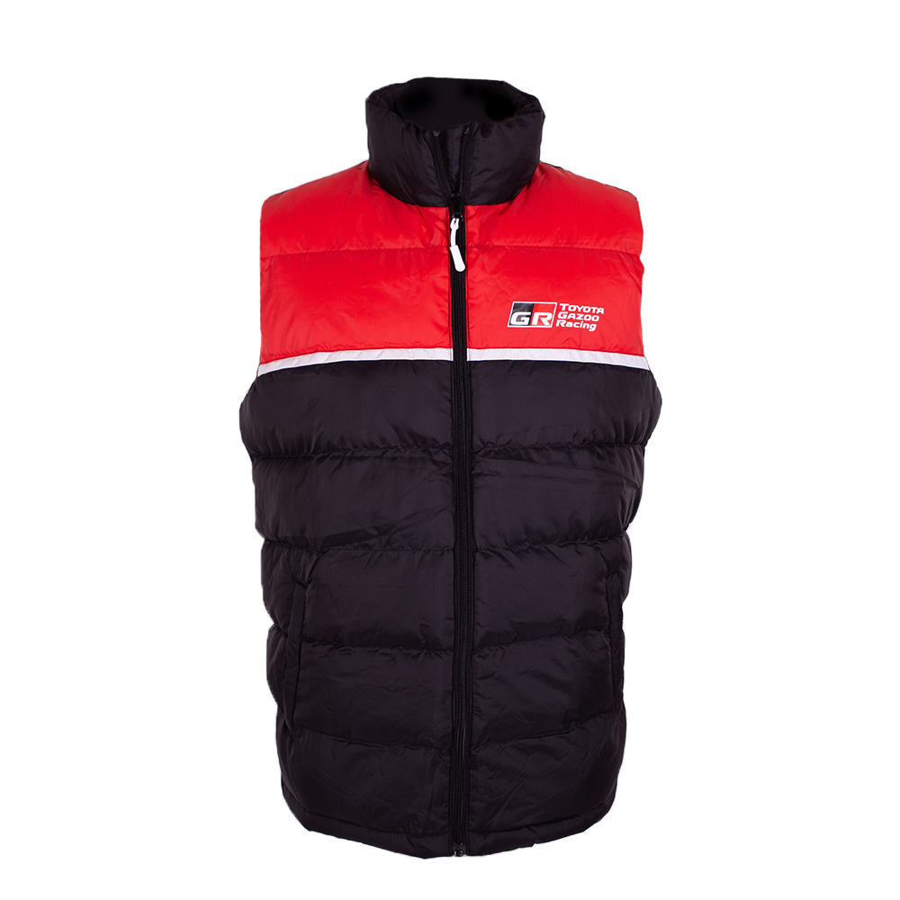 100% nylon outer puffer vest with raised mock neck collar and longer line back for comfort.