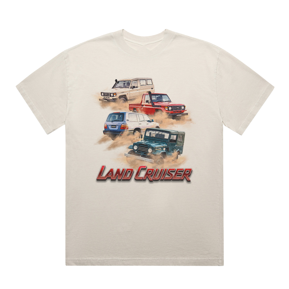 The Toyota Vintage LandCruiser Heavy Legacy Stone Tee blends durability, comfort, and iconic style. Crafted from 100% carded cotton with a heavy 240 GSM weight, this tee is built to last. Features a boxy oversized fit, dropped shoulders, and twin-stitched wide neck ribbing for a relaxed and durable look. The garment dye finish provides a unique, worn-in vibe, while the multiple model vintage print showcases the iconic LandCruiser evolution over the years.