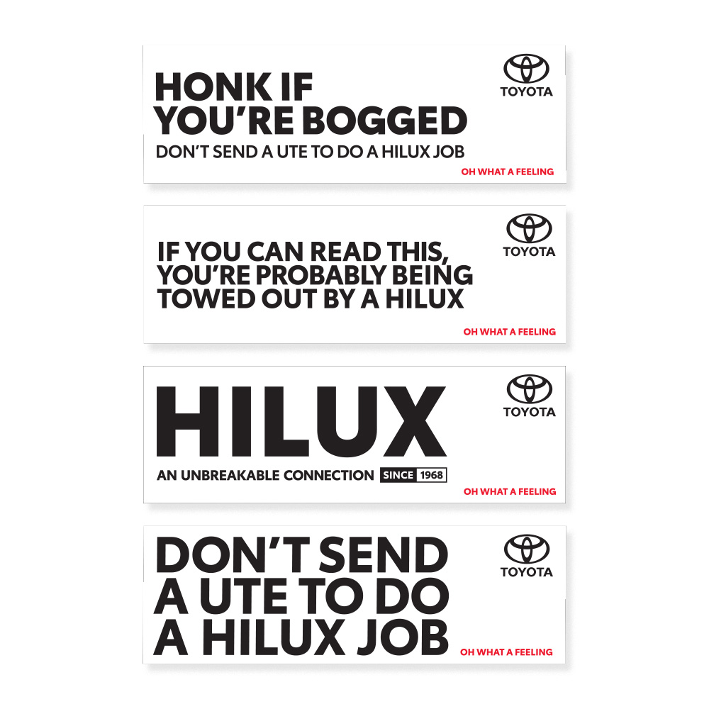 Made for HiLux drivers who appreciate a bit of humour and heritage, the Toyota HiLux Bumper Stickers set adds personality to vehicles, toolboxes, and gear. Featuring four distinct HiLux-themed slogans, this set is ideal for everyday use, dealership merchandise, or promotional giveaways. Compact and easy to apply, these stickers are a simple way to showcase HiLux pride on and off the road.